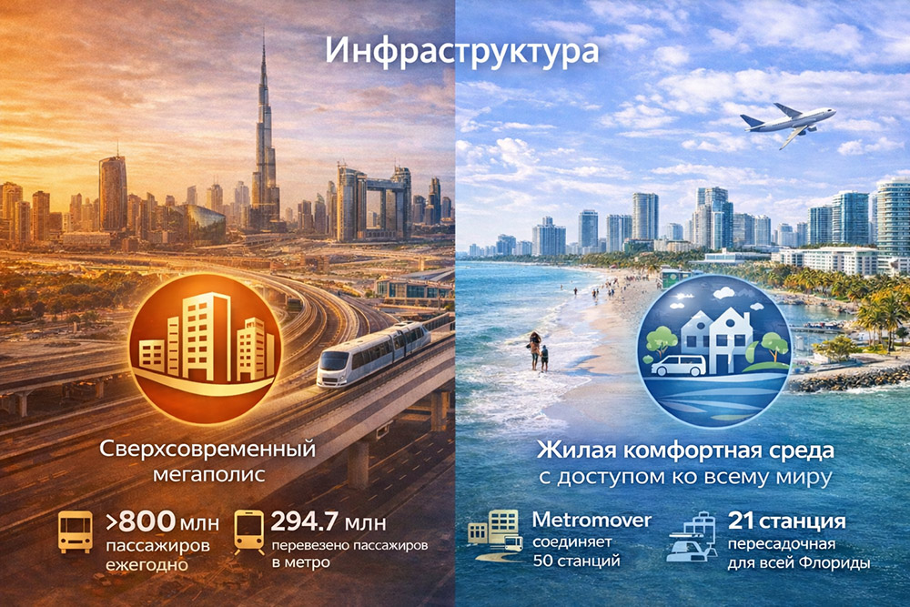 Инфраструктура. Дубай - сверхсовременный мегаполис, Майами — жилая комфортная среда с доступом ко всему миру