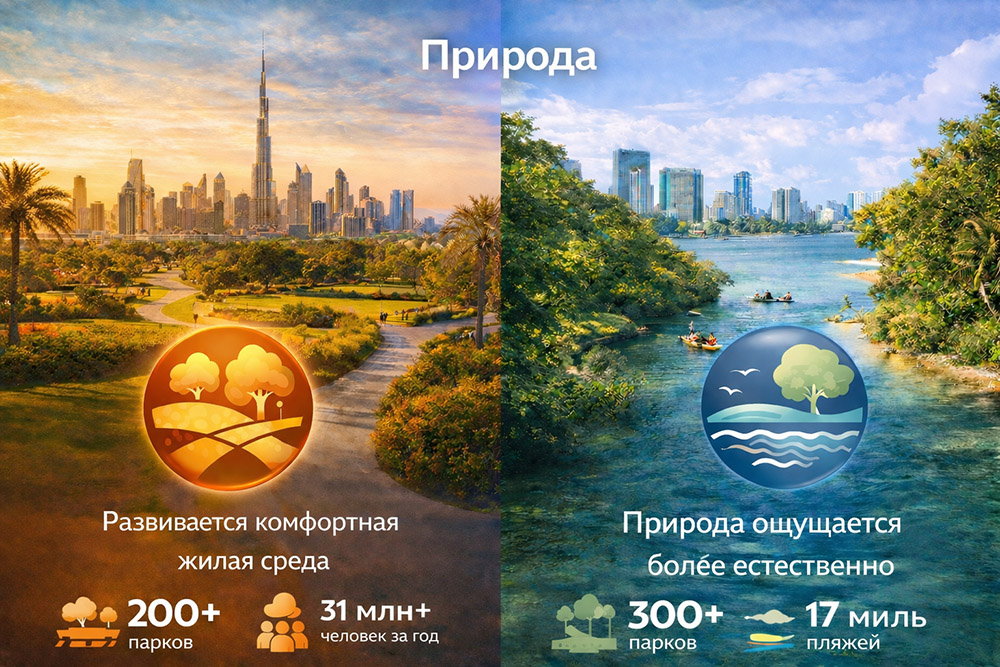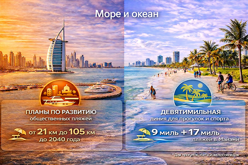 | Море и океан | Жизнь у воды во многом создана через девелоперские и инфраструктурные проекты | Океан — часть повседневной жизни, спорта, прогулок и семейного досуга | Дубай — более статусный и организованный формат, Майами — более естественный и повседневный |