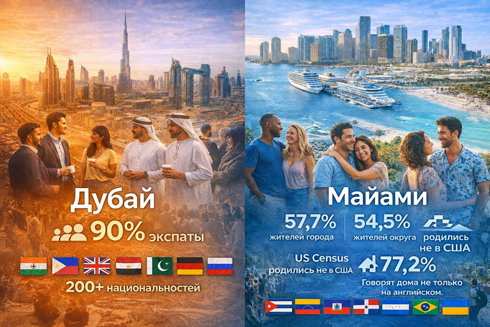 И Дубай, и Майами — международные города, где иностранное происхождение жителей и языковое разнообразие заметны не только в бизнесе, но и в повседневной жизни.