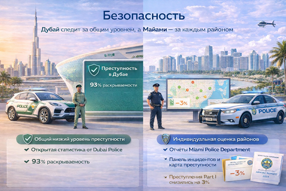 И в Дубае, и в Майами безопасность — один из ключевых факторов при выборе района и недвижимости. Но подходить к сравнению важно с учетом особенностей этих двух мегаполисов.